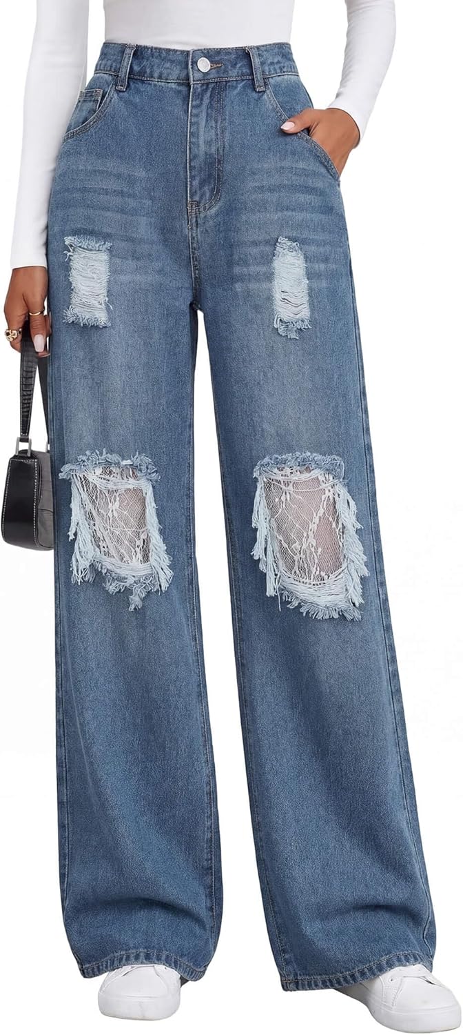 - Features: The lace-textured rips provide a fresh take on distressed denim, wide leg jeans make a trendy yet timeless aesthetic a unique distressed look that elevates everyday outfits with eye-catching detail.