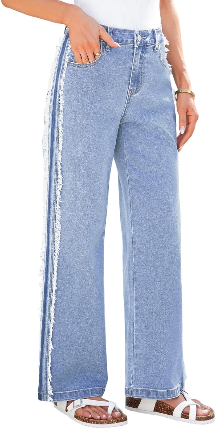 - Feature: Our high waisted jeans elongate the waist for a flattering silhouette. The wide straight leg cut provides a loose and relaxed fit, while the side panel patchwork adds a modern, fashionable twist. The pockets make it easy to carry small items